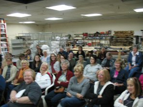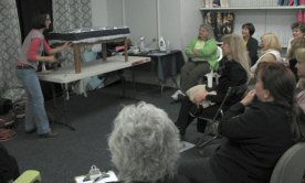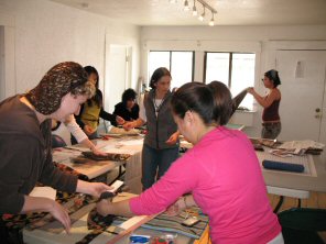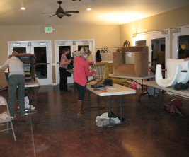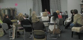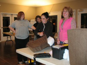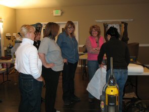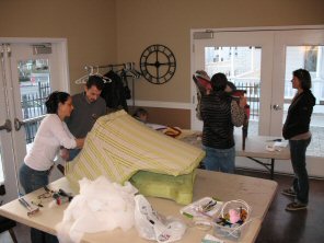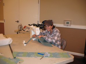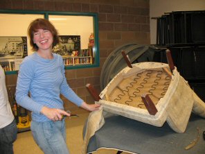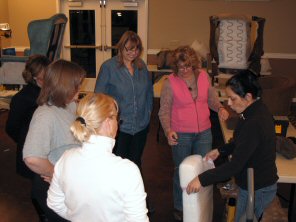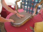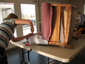 After stapling the flexible metal strip, Lori continues placing the padding on back of chair |