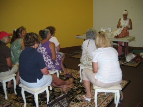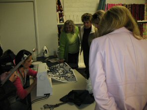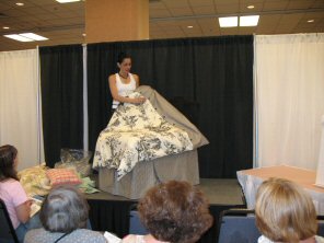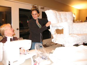 Jackie demonstrating how to insert a cushion pad into its cushion cover |