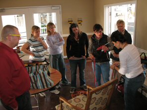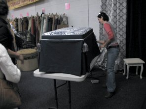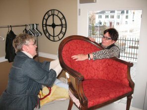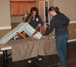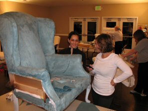 Jennifer and Randy working together to mold Ultra Suede fabric to the arm of the chair |