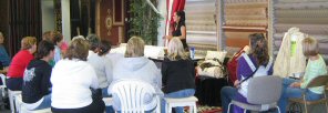 Checking for webbing quality. Then after sanding her chair, she applied wood finish stain, giving a rich color to the chair |
