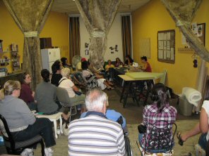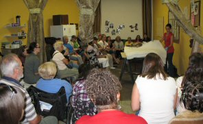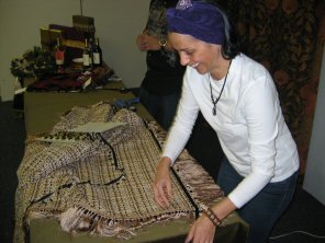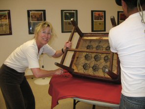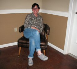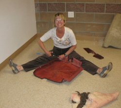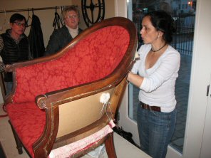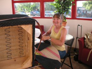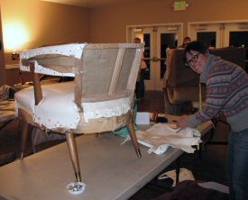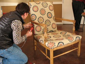 Leslie happy to start her art piece. This chair has been waiting for 15 years and now she is taking staples out |