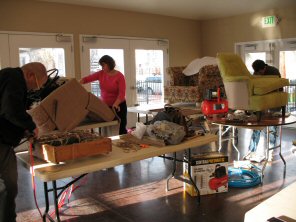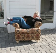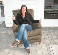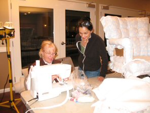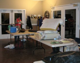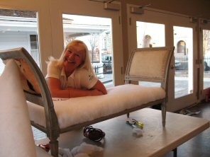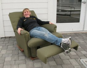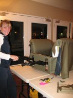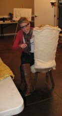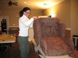 Cheryl cleaning up old staples on the disassembled recliner (left). Rebuilt padding and redesigned arms of recliner for a totally new look (right). |